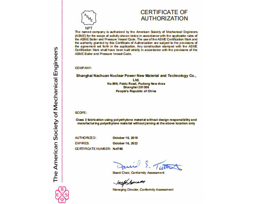 ASME核3級(jí)授權(quán)證書(NPT)